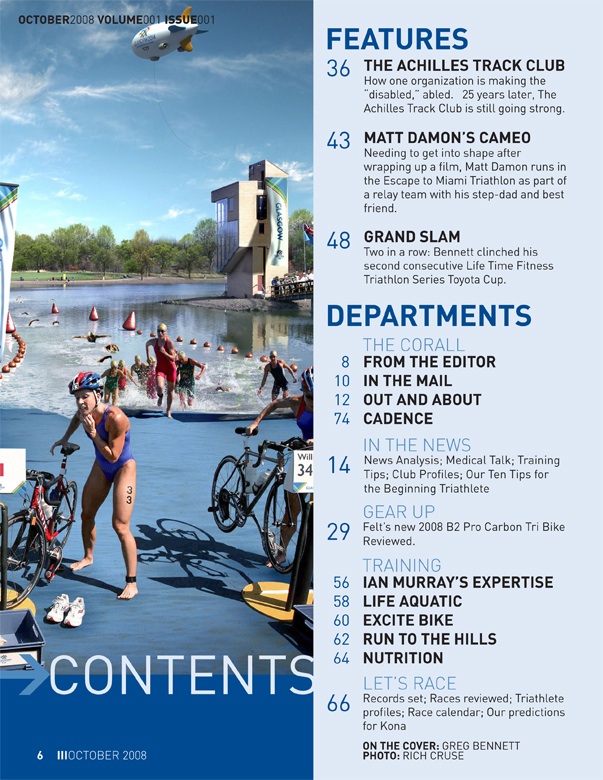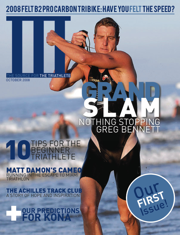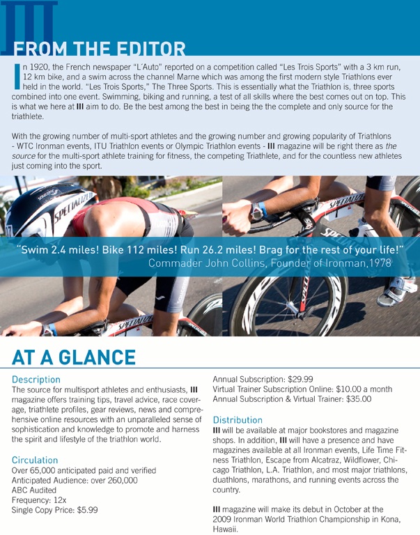 Not too long ago, I was involved with a group who pitched for a new sports magazine called III. It was a magazine devoted to the lifestyles of triathletes and the sport of the triathlon. I came up with the bulk of the branding and identity. I went with Greg Bennett for the cover we pitched with. He was Mr. Triathlon at the time, having won all 3 major U.S. triathlons.