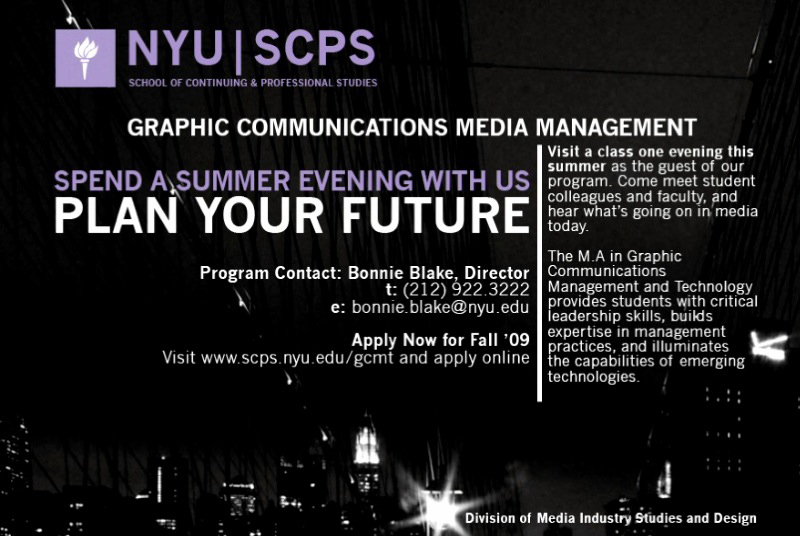 At the request of the Director for NYU's Graphic Communications Management & Technology program, I designed a post card for a direct mail campaign. I wanted to come up with something different from what GCMT tends to release. In comparison I feel this is a bit more appealing, appropriate, and representative of my alma mater's program.
