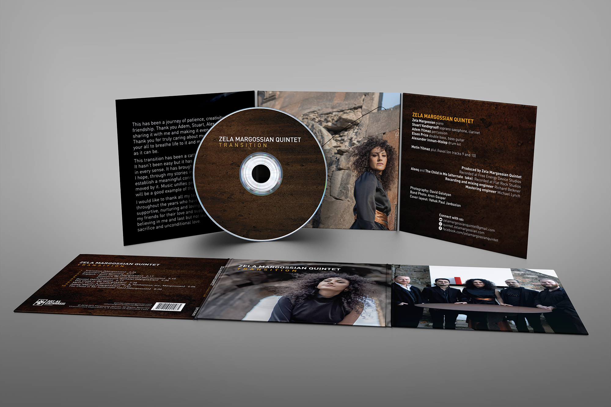 This is the design I did for the debut album of Sydney based world jazz group, Zela Margossian Quintet. I wanted to go for a very clean look with striking photography that invoked a modern yet cultured feel. We went with an all cardboard packaging to avoid plastic trays. This album came out in November of 2018 and was nominated for an ARIA (Australian Recording Industry Association Music Award).