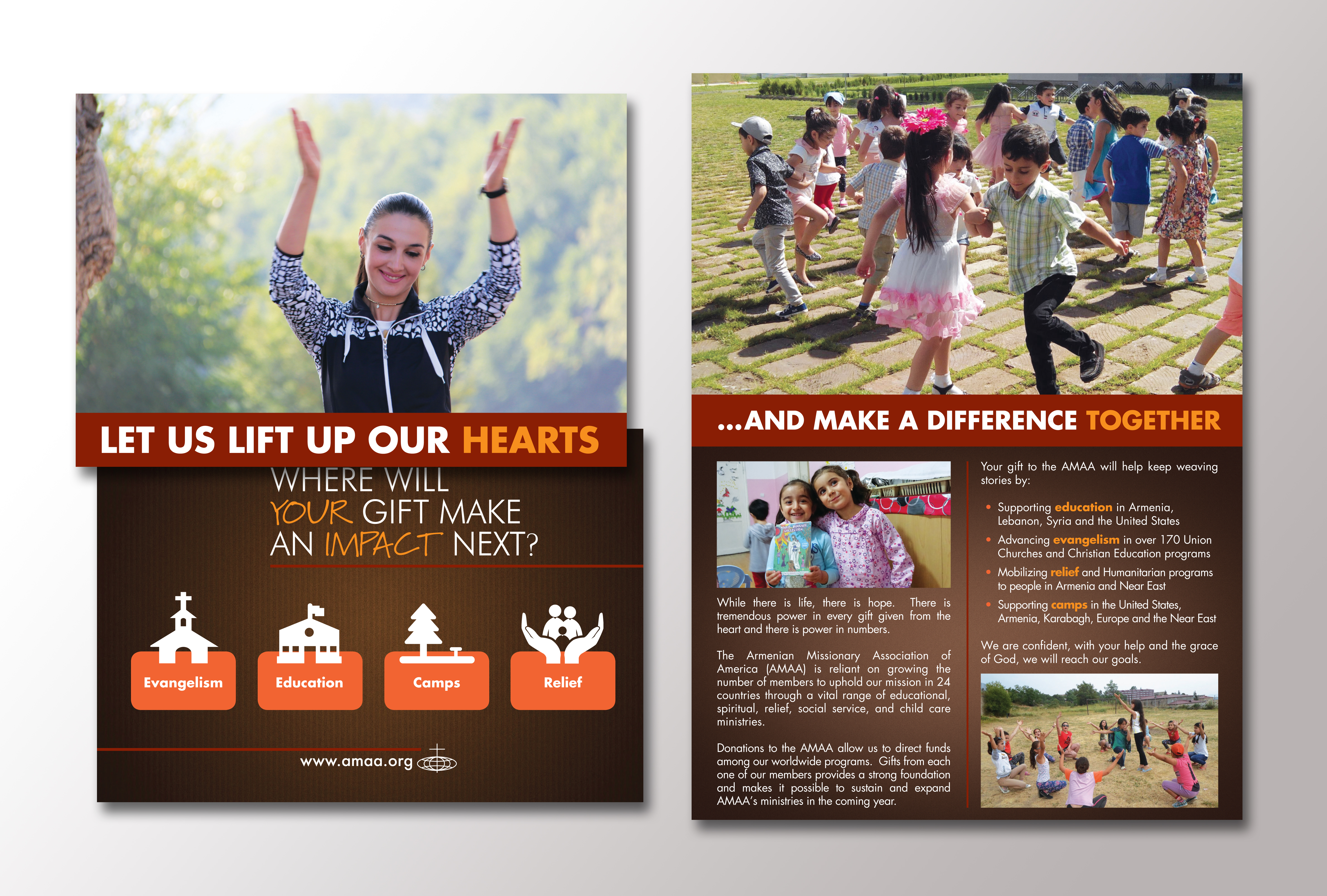 This is a card I designed for AMAA's Fall Appeal. This card is easy to read, airy and not overwhelmed with too much copy. Through the use of an autumn color palette, clean type and bright images, this campaign speaks to the organization's professionalism and its commitment to humanitarian relief and social outreach