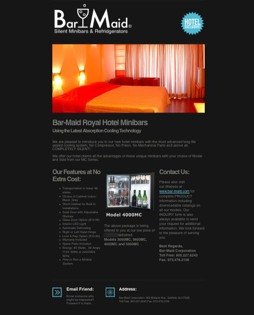 If you've ever stayed in a hotel on the East Coast, then you've probably partaken in a beverage from the minibar. More than likely, it was a Bar-Maid. Not too long ago, Mr. George Steele of Bar-Maid Corp. reached out to me to help with their Hotel Exclusive email marketing campaign. It was directed at their major hotel contacts.