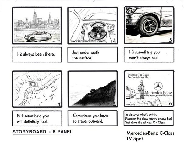 During my time at NYU, some of my classmates and I had the pleasure of competing in the annual MBUSA C-Class Ad Pitch Contest. We really wanted to come up with a solid tag line and an equally solid commercia. The tag line we came up with was, "Discover the class you've always had." I was given the task of coming up with the commercia and this is the storyboard for it. While we were runner ups, we were told by numerous people on the judging panel from MBUSA that we had the best tag line.