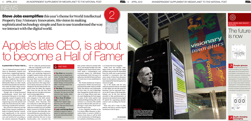 This is a spread from the design I did for Mediaplanet. This was from the Intellectual Property (IP) issue that was featured in the National Post and other morning publications. I felt that the color red accentuates importance of IP. The late Steve Jobs was the cover story, and the cover features a younger photo of him with a light red background which compliments the dark red in a vintage sort of way.