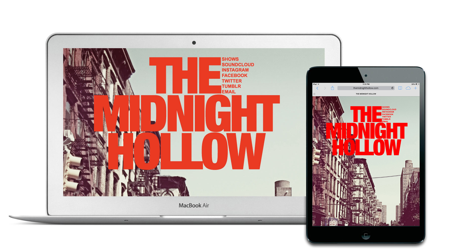 This is a website I did for Brooklyn based gazey crooners, The Midnight Hollow. They wanted something dark, simple, efficient that links to all their social media, music, and contacts.
