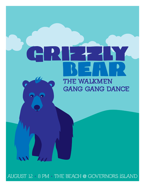 After seeing the poster for last year's Grizzly Bear concert at Governor's Island, I wasn't too pleased and decided something needed to be done. So, I decided to do one myself. In the style of the new school illustrated concert posters, I went with what else, but a big ol' cuddly blue bear. Using crisp vectors and clean type, I arrived at something simple in style and nature. I hope to be doing more of these in the future.