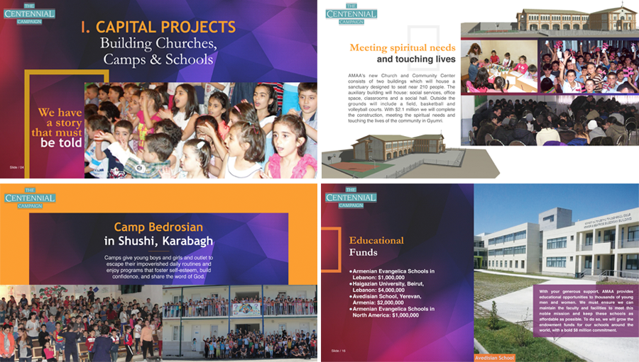 This is a presentation I recently designed for The Centennial Campaign. It is a fundraising effort for AMAA's humanitarian and educational endeavors in Eurasia in honor of their 100th anniversary of their establishment. I followed the color scheme of their printed material that would be given to potential donors and patrons along side this presentation.