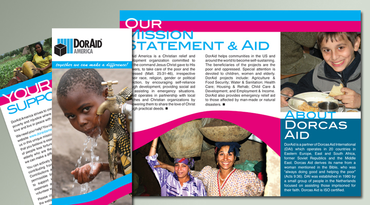 DorAid America is a non-profit, charitable, and out-reach organization. It is the American branch of Dorcas Aid International, headquartered in the Netherlands. This is a brochure for DorAid America's upcoming Spring fundraising campaign. This is another straight forward tri-fold brochure. Following Dorcas Aid's corporate branding and identity, I came up with something that is a little bolder and sleeker.