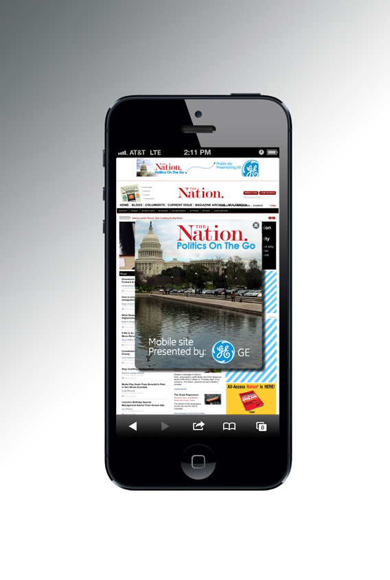 This is a mobile ad I designed for The Nation's mobile site. It's for GE's sponsorship of The Nation. I followed GE's branding and added a bit of D.C., making it work for a political site like TheNation.com..