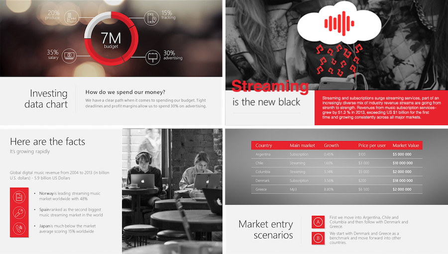 Next Big Sound is a New York-based company which provides analytics for online music. I came up with a PowerPoint for their Digital Music Report with a simple relaxing color palette, eye-catching photos, and legible fonts for easier comprehension. This resulted in a series of slides broken up in a digestible manner, melding lifestyle imagery with flat icons to best explain their insights into the changing landscape of the music industry globally and the developments in the digital sector.