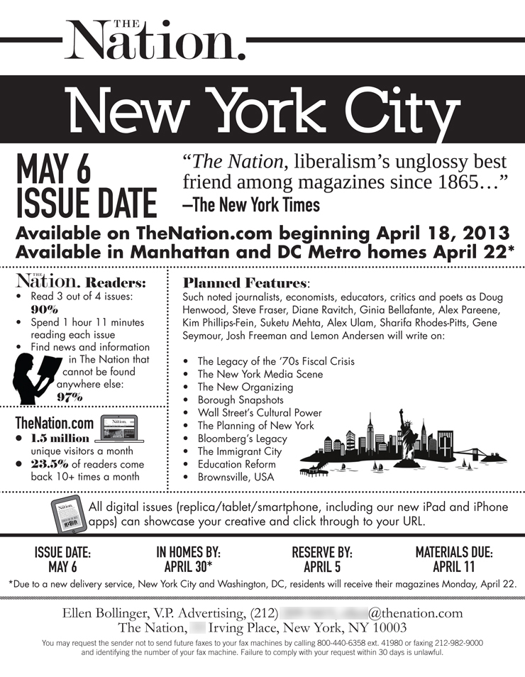 This is a sales sheet I did for The Nation for their New York City issue. This would to potential advertisers. I wanted to go for a infographic type feel, but at the same time be clear and direct for client.