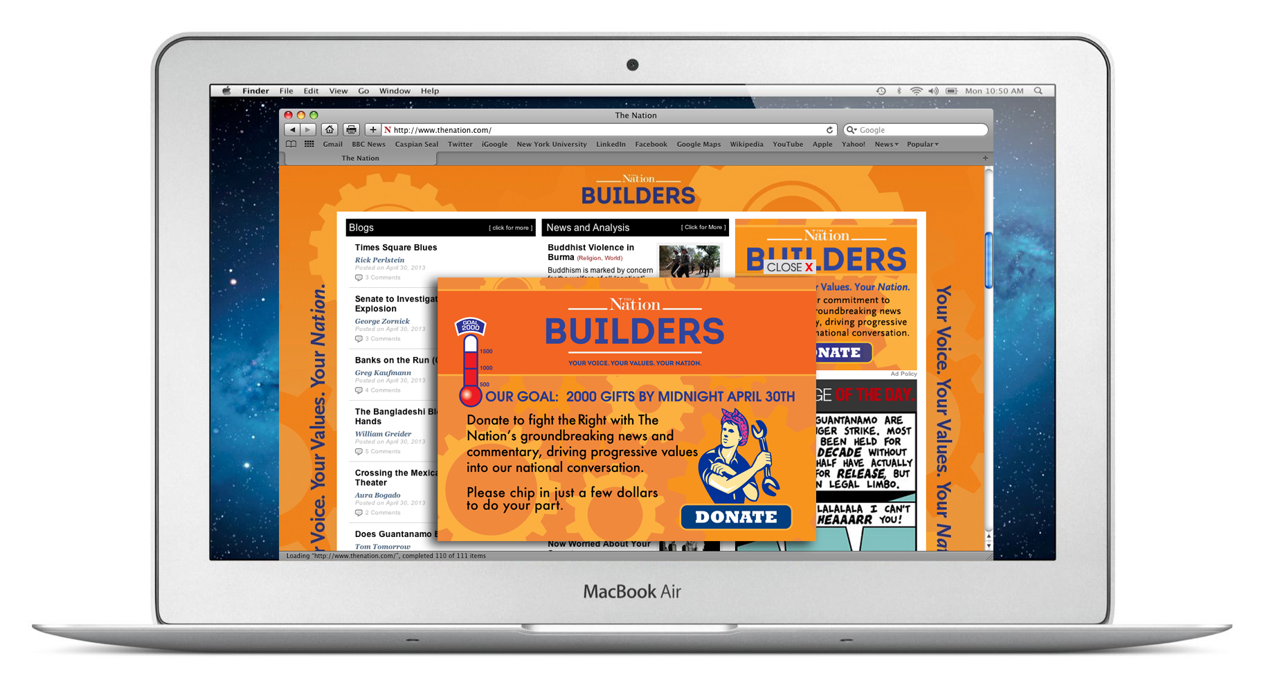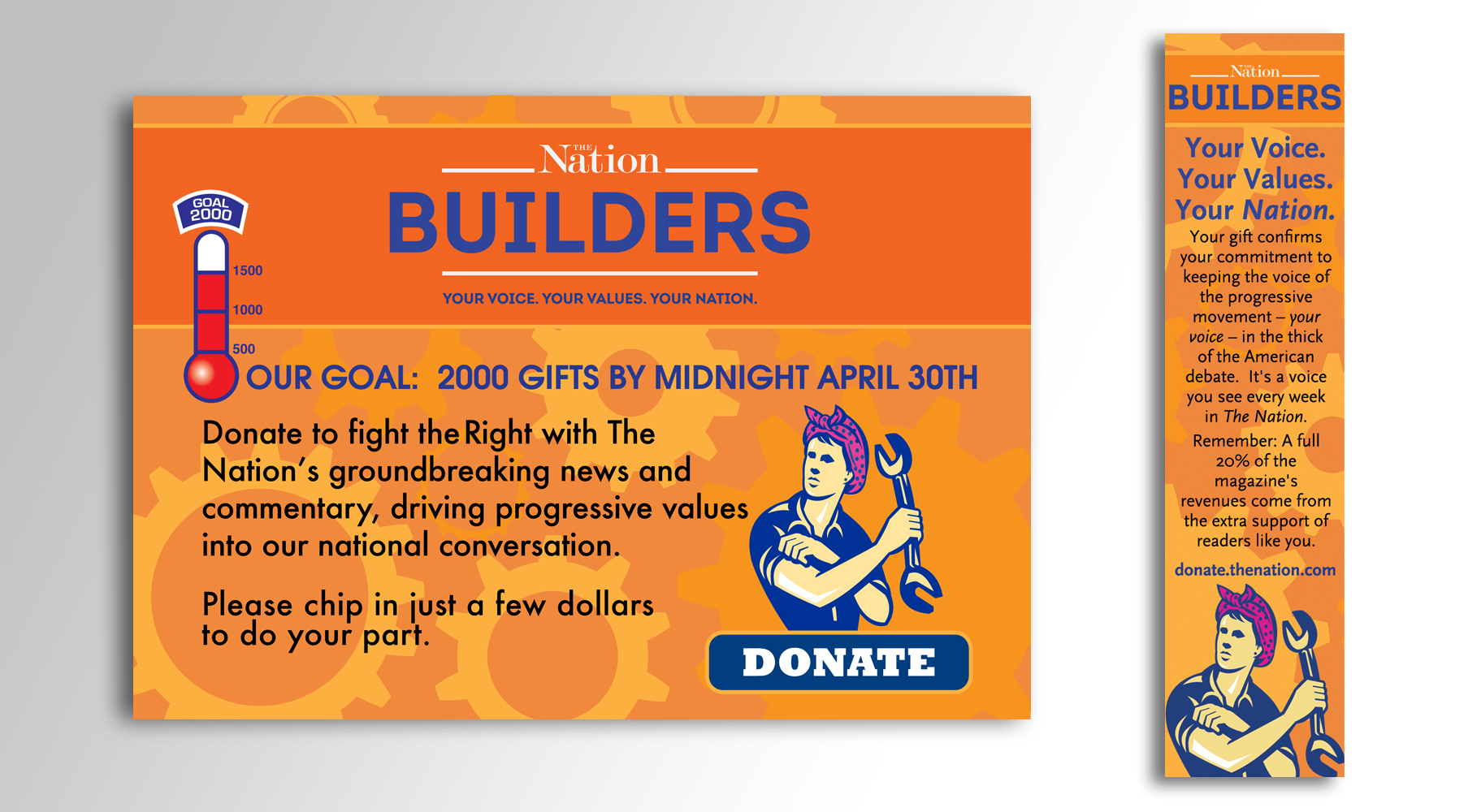 This is the design I did for The Nation's annual fundraising campaign, Nation Builders. I adhered to the WPA Poster concept/idea that they use every year. The design consisted of a taker over design for the site which included a lightbox that appeared upon visit of the site. I also provided a complementing print ad component.